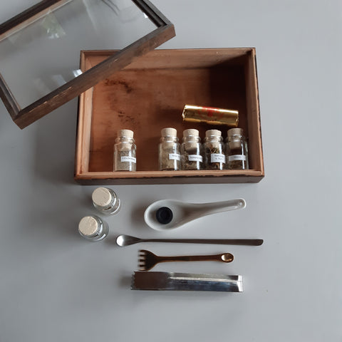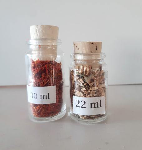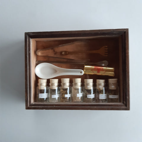 Inhalt: 7 Snap-Cap à 22ml mit Korken, gefüllt nach Wahl oder mit verschiedenen Mischungen oder 6 Kräutern und 1 Harz. Ein Räucherlöffel aus Edelstahl, eine Edelstahlzange für die Räucherkohle, ein Messing-Löffel/Rechen, ein Keramiklöffel für die Räucherkohle-Räucherung. Eine Kohlerolle 2 cm.
