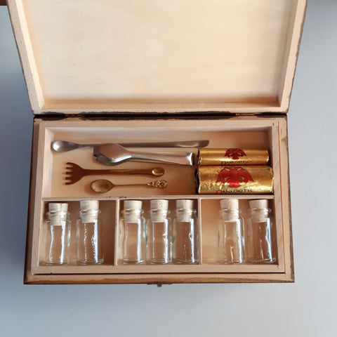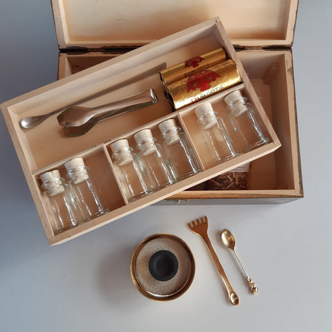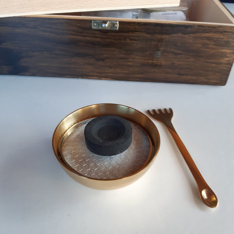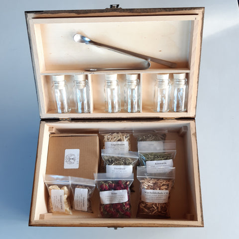 Inhalt: je 1 Messing Räuchergefäss mit Sand und feinem Sieb, Edelstahlzange und Löffel, Rechenlöffel aus Messing und kleiner Löffel. 2 Kohlerollen Ø 2 und 3,7 cm. Kräuter: je ein Rose, Eisenkraut, Salbei, Rosmarin. Hölzer: Feigenbaum, Wacholder. Harze: Fichtenharz und Weisser Copal. 7 Snap Cap 30ml leer mit Korken.