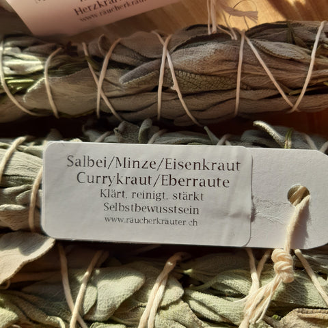 Nach Gebrauch wieder auslöschen (ausdrücken im Sand oder mit etwas Wasser). Ein Bündel kann mehrmals benutzt werden. Hauptbestandteil ist meist Salbei.