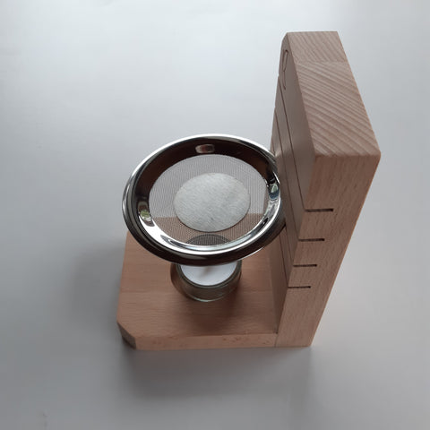 Schönes und praktisches Stövchen aus Buchenholz, mit Glas-Teelichthalter. Neu, ungebraucht. Das Sieb ist höhenverstellbar. Es hat eine kleine Metallplatte um die Hitze zu verteilen, die man auf das Sieb legen kann.