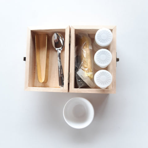 kleine, helle Holzschatulle mit allen Räucherutensilien. Deckel gerundet.