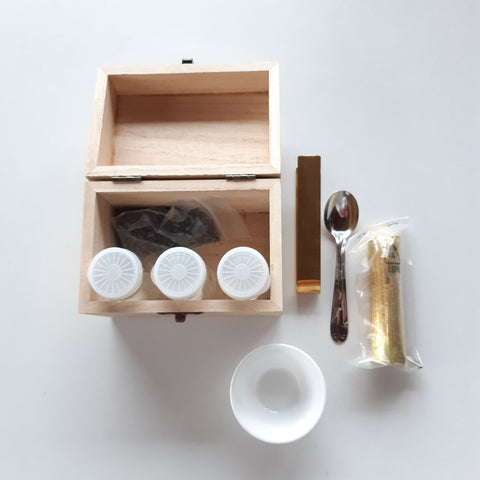 Inhalt: 3 Snap-Cap Gläsli 30 ml mit Weihnachtsmischung, Lavendel und Styrax (oder nach Wahl) gefüllt. Messingzange und Löffel, Räucherschäleli und grober Sand, Kohlerolle 2 cm