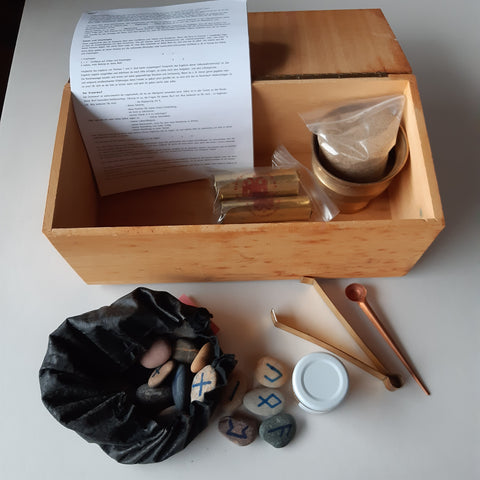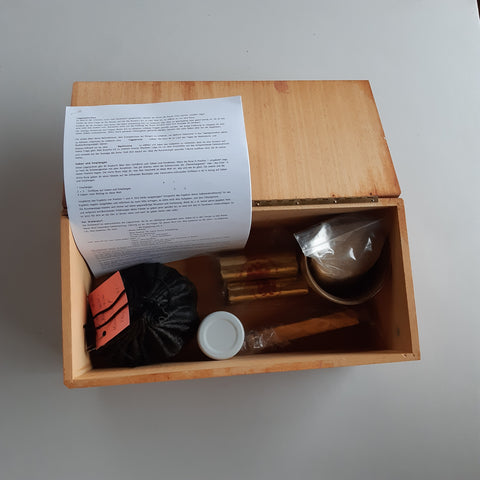Stabile Sperrholzschachtel mit Farb-Pigmenten.  Darin alle Räuchersachen und Runen aus Flusssteinen inkl. Runenbeschreibung. Inhalt: Räuchergefäss aus Messing (ungebraucht) mit Sand, Orakelmischung in 30ml Schraubglas, Runen aus Flusssteinen in Lederbeutel , blau Beschriftet inkl. Runenanleitung/Bedeutungen, Messingzange und Kupferlöffel, 2 Räucherkohlerollen à 2 und 3 cm