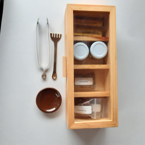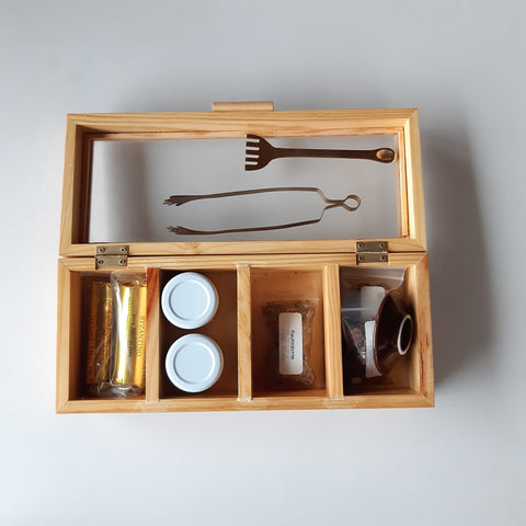 Räucherset in Holzschatulle, Deckel mit Glas.