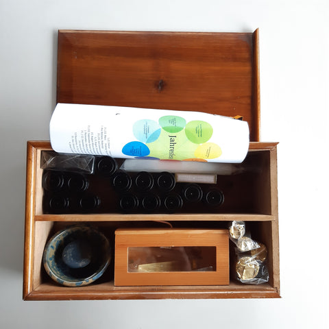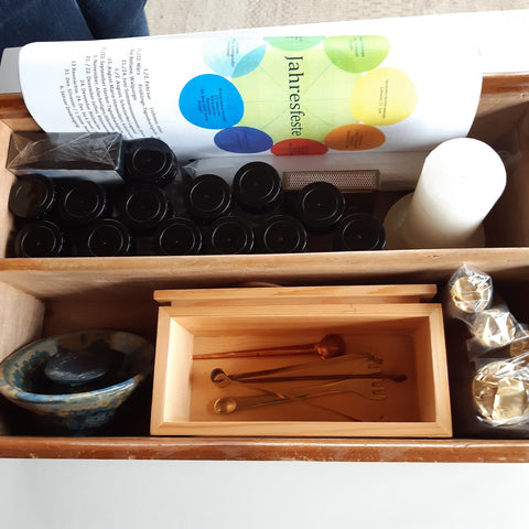 Sehr schöne antike Schatulle, mit einem Schiebedeckel, darin 13 Mischungen für die Jahresfeste und einem Beschrieb jedes Festes und der zugehörigen Räuchermischung. Mit Ritualvorschlag und eine Liste der einzelnen Räucherstoffe für die Jahresfeste.