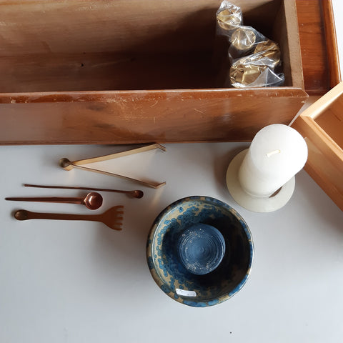 Räucherbesteck in kleiner Schatulle: 2 Kupferlöffel, je 1 Räucherzange und ein Löffel-/Rechen aus Messing