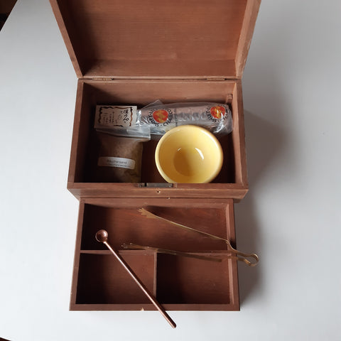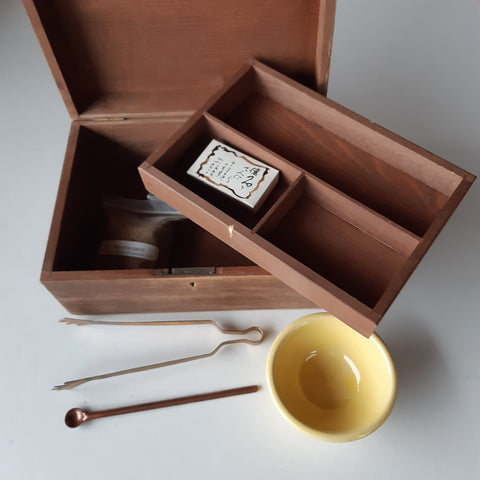 Inhalt: Räucherschale mit Sand, Kohlerolle 3cm, Zündhölzer, Messingzange und Kupferlöffel, Räuchermischung Reinigung